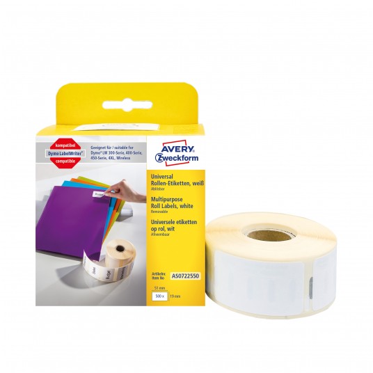 • Usuwalne etykiety uniwersalne Avery Zweckform w rolce do drukarek termicznych
