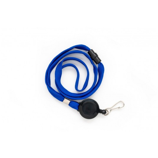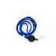 Taśma wypinająca z mechanizmem ściągającym i karabińczykiem w kolorze niebieskim.