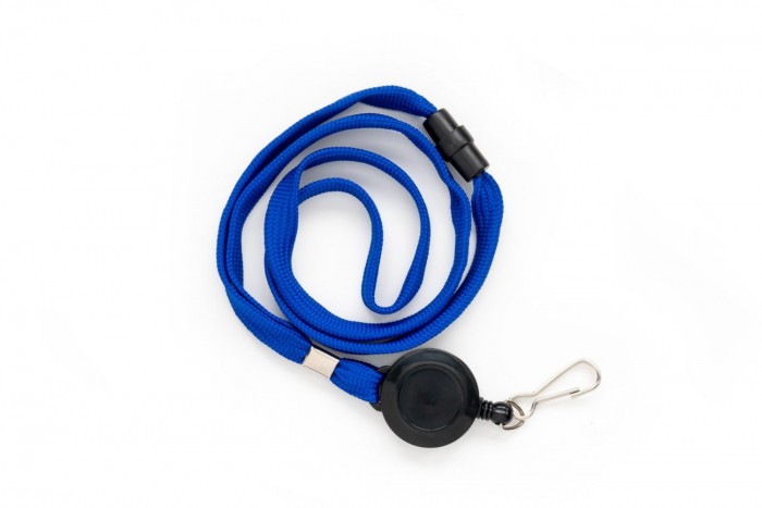 - na końcu czarny mechanizm ściągający z metalowym karabińczykiem umożliwiający wyciągnięcie identyfikatora na odległość