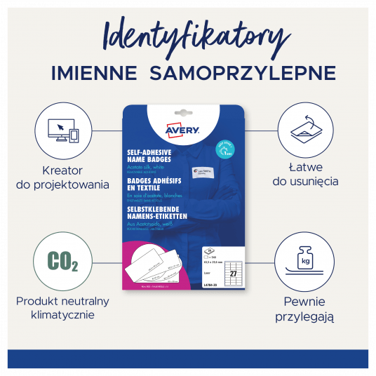 - Produkcja identyfikatorów Avery Zweckform jest neutralna pod względem emisji CO2 (certyfikat Focus Future) i zgodna ze standardem ISO14001, który pomaga zminimalizować negatywne czynniki oddziałujące na środowisko naturalne.