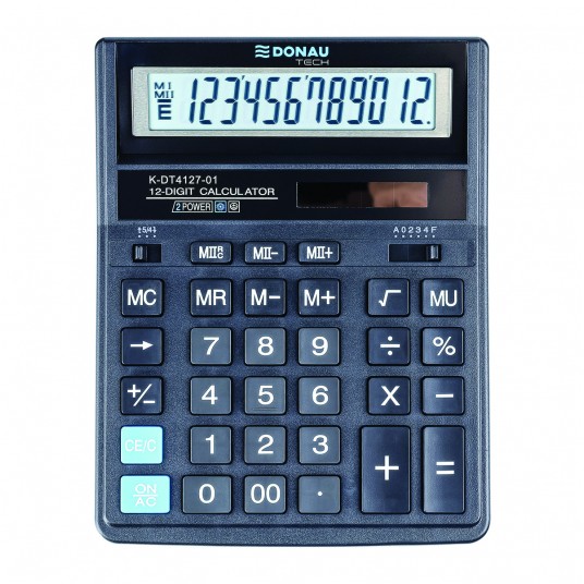 - kalkulator z 12-cyfrowym wyświetlaczem z zasilaniem bateryjno-solarnym